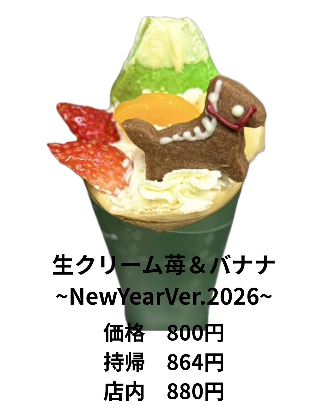 生クリーム苺&バナナに干支のクッキーを飾ったクレープです。