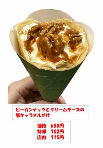 生クリームとピーカンナッツ、クリームチーズを入れ、塩キャラメルをかけたクレープです。
